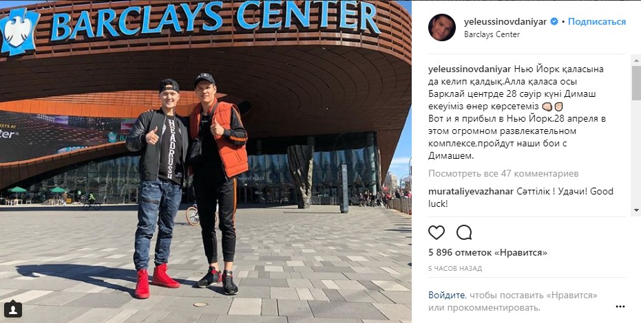 "Вот и я прибыл в Нью Йорк. 28 апреля в этом огромном развлекательном комплексе пройдут наши бои с Димашем", — написал олимпийский чемпион в своём Instagram. (Орфография и пунктуация сохранены)