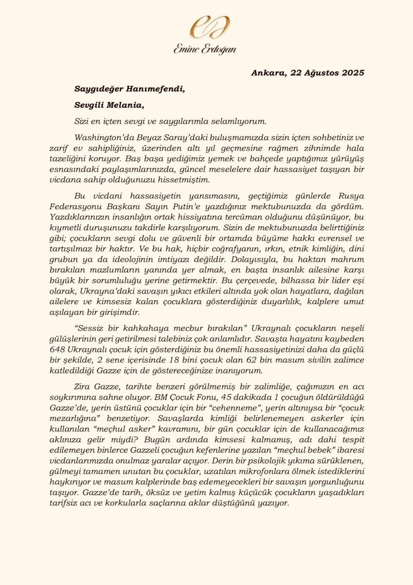 Эмине Эрдоган сообщила, что ее вдохновило письмо супруги американского лидера, которое Дональд Трамп передал президенту РФ Владимиру Путину во время встречи на Аляске. Послание касалось положения детей на фоне российско-украинского конфликта.