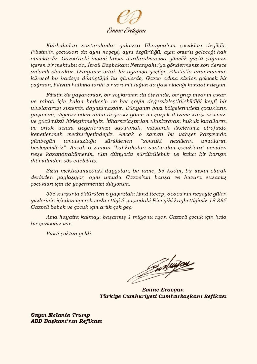 Жена турецкого лидера Эмине Эрдоган написала первой леди США Мелании Трамп письмо, в котором призывает поднять вопрос о тяжелом положении детей в Газе. Об этом сообщили в Администрации президента Турецкой Республики, передает BAQ.KZ со ссылкой на Report.