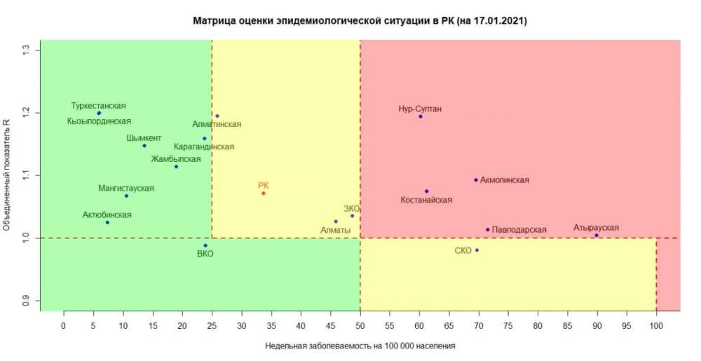 Опубликована матрица оценки эпидемиологической ситуации в регионах Казахстана на 17 января 2021 года, передает BaigeNews.kz со ссылкой на coronavirus2020.kz.