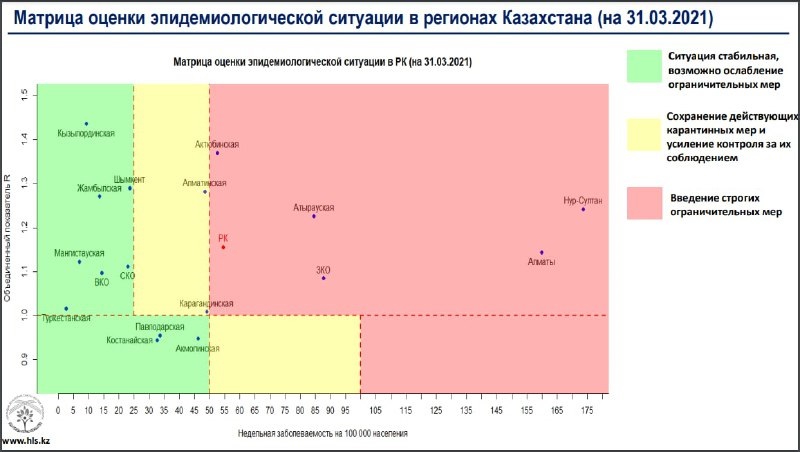 Опубликована матрица оценки эпидемиологической ситуации в регионах Казахстана на 31 марта 2021 года, передает BaigeNews.kz.