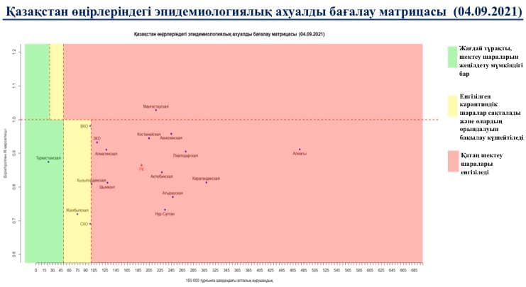 Опубликована матрица оценки эпидемиологической ситуации в регионах Казахстана на 4 сентября 2021 года, передает BaigeNews.kz со ссылкой на coronavirus2020.kz.