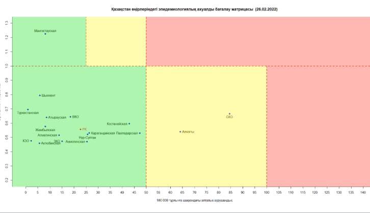 Опубликована матрица оценки эпидемиологической ситуации в регионах Казахстана на 26 февраля 2022 года, передаёт BaigeNews.kz со ссылкой на coronavirus2020.kz.