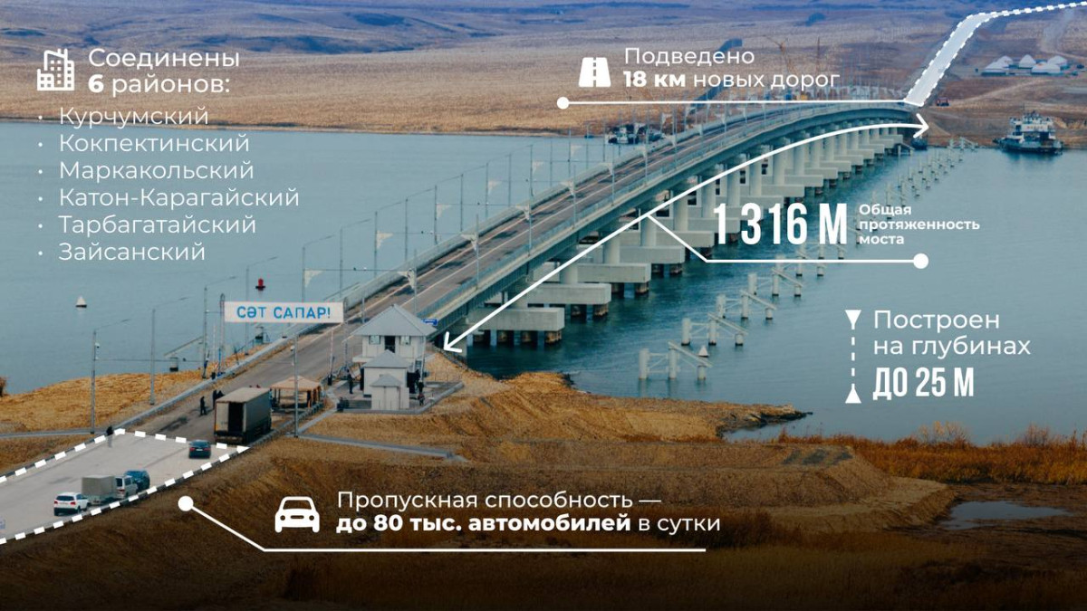 Восточный Казахстан — это стратегический регион, через который проходят важные транспортные коридоры. Мост через Бухтарминское водохранилище улучшит логистические маршруты, обеспечит бесперебойные связи с приграничными странами.