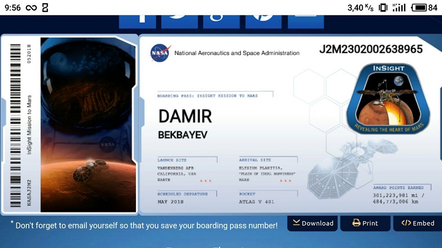 Как сообщается на сайте лаборатории НАСА, в мае 2018 года с мыса Канаверал стартует космический корабль InSight со спутником, предназначенным для исследования поверхности Марса. Имена жителей земли, в том числе и Дамира, будут внесены в кремниевый чип, который отправится путешествовать вокруг Красной планеты.