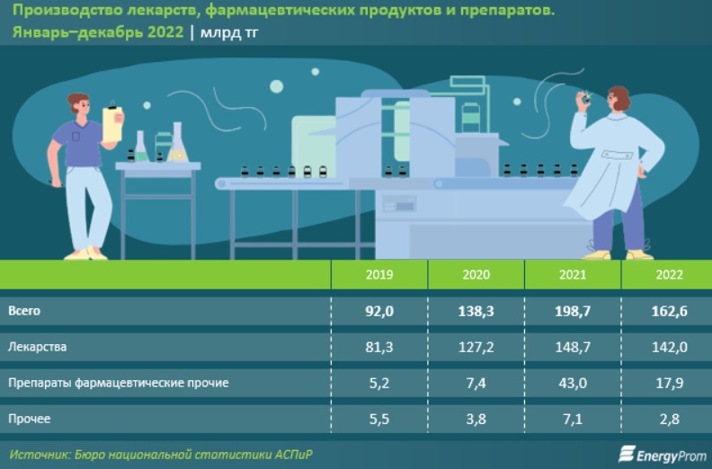 "Производство лекарств и фармацевтических препаратов в Казахстане за прошедший год в стоимостном выражении сократилось на 36,1 миллиарда тенге, или на 18,2 процента. Если по итогам 2021 года фармкомпании выпустили продукции на 198,7 миллиарда тенге, то в прошлом году - всего на 162,6 миллиарда тенге.
