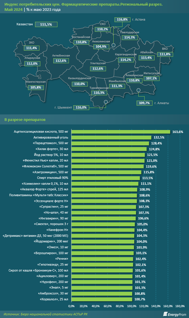 В региональном разрезе цены в секторе подскочили сильнее всего в Астане (сразу на 16,8% за год), Шымкенте (на 16%), Павлодарской (на 14,3%), в Карагандинской (на 14,2%) и Абайской (на 13,4%) областях. Наименьшее годовое удорожание фармпрепаратов отмечено в Акмолинской (плюс 4,9%), Мангистауской (плюс 5,8%) и Жетысуской (плюс 7,1%) областях.