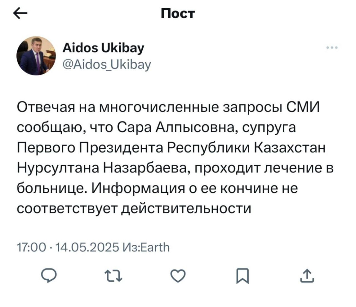 "Отвечая на многочисленные запросы СМИ сообщаю, что Сара Алпысовна, супруга Первого Президента Республики Казахстан Нурсултана Назарбаева, проходит лечение в больнице. Информация о ее кончине не соответствует действительности", - написал он в соцсетях.