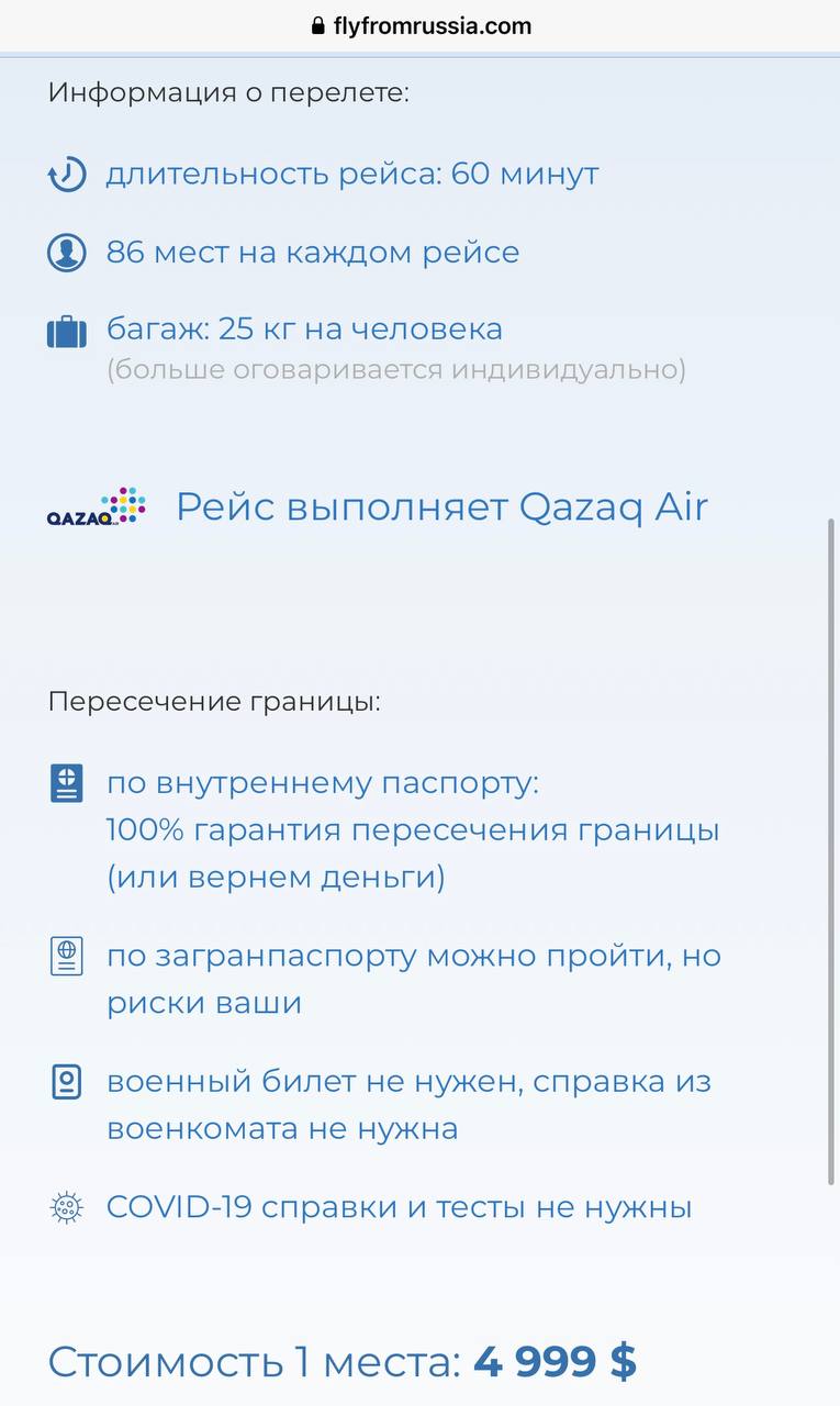 В соцсетях начала распространяться информация о якобы спецрейсах из России в Казахстан, билет на которые стоят 4999 долларов. Авиакомпания АО "QAZAQ AIR" опровергла эту информацию, сообщает BaigeNews.kz со ссылкой на пресс-службу авиакомпании.