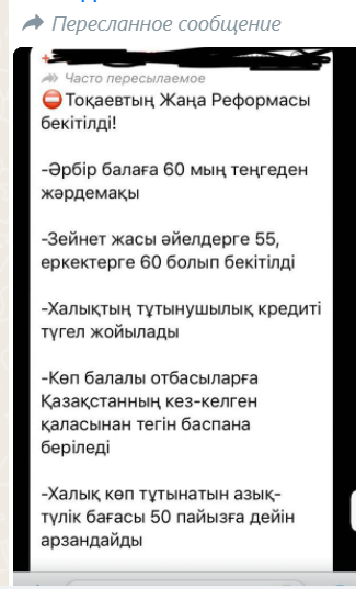 В сообщении, которое пересылали друг другу казахстанцы, говорилось о том, что детям в стране будет положена выплата в размере 60 тысяч тенге, пенсионный возраст для женщин и мужчин будет снижен до 55 и 60 лет соответственно, все потребительские кредиты спишут, а многодетным семьям выдадут квартиры.