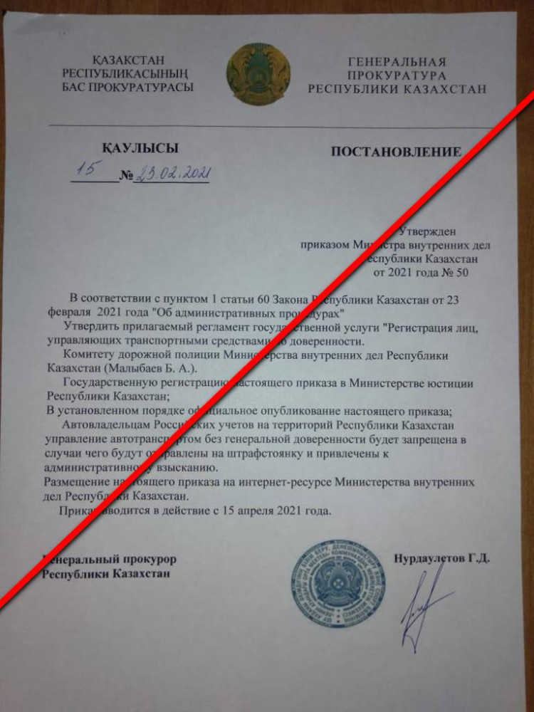 Казахстанцы пересылают друг другу фотографию документа, который якобы запрещает владельцам машин, поставленным на учет в России, ездить без генеральной доверенности на территории РК, передает