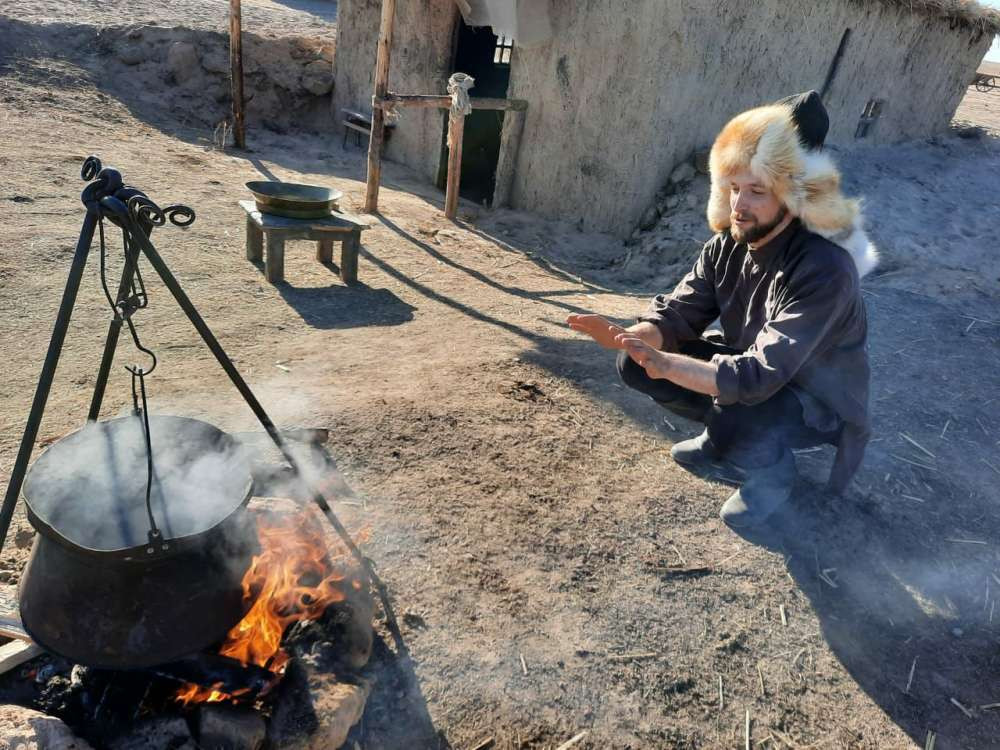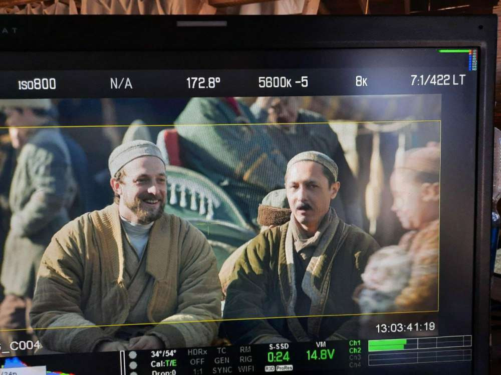 Это куча реквизита, причем, он был не бутафорский: настоящие яблоки, гранаты, рыба сушеная, вяленая, орехи, сухофрукты, чайники, казаны. Дублей было много, так как в массовке тяжело контролировать всех. Не с первой и даже не с десятой попытки, но слаженности процесса удалось достигнуть. А вообще, специфика фильма подразумевает именно съемки уличные. Крайне редко это может быть интерьер юрты или купеческого поместья, в основном — это аул, степь…