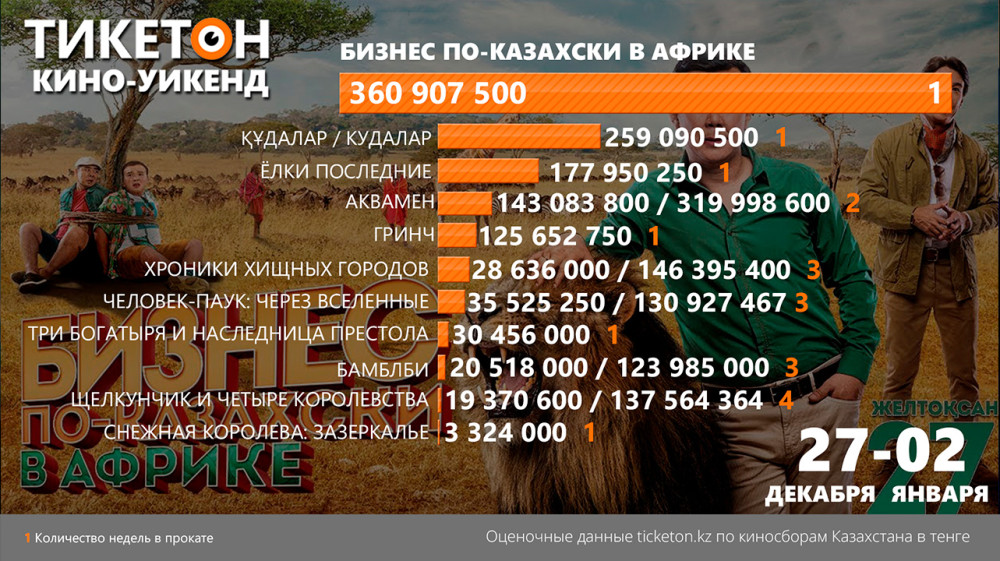 Фильм Нурлана Коянбаева "Бизнес по-казахски в Африке" в течение двух недель входит в ТОП-кассовых кинокартин в Казахстане. По итогам пяти дней фильм успел собрать свыше 360 млн тенге. А по итогам двух недель - более 492 млн тенге.