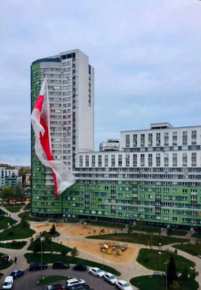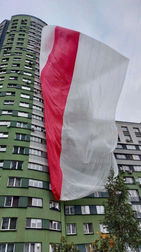 В минском ЖК "Каскад" жители подняли очень большой бело-красно-белый флаг, передает