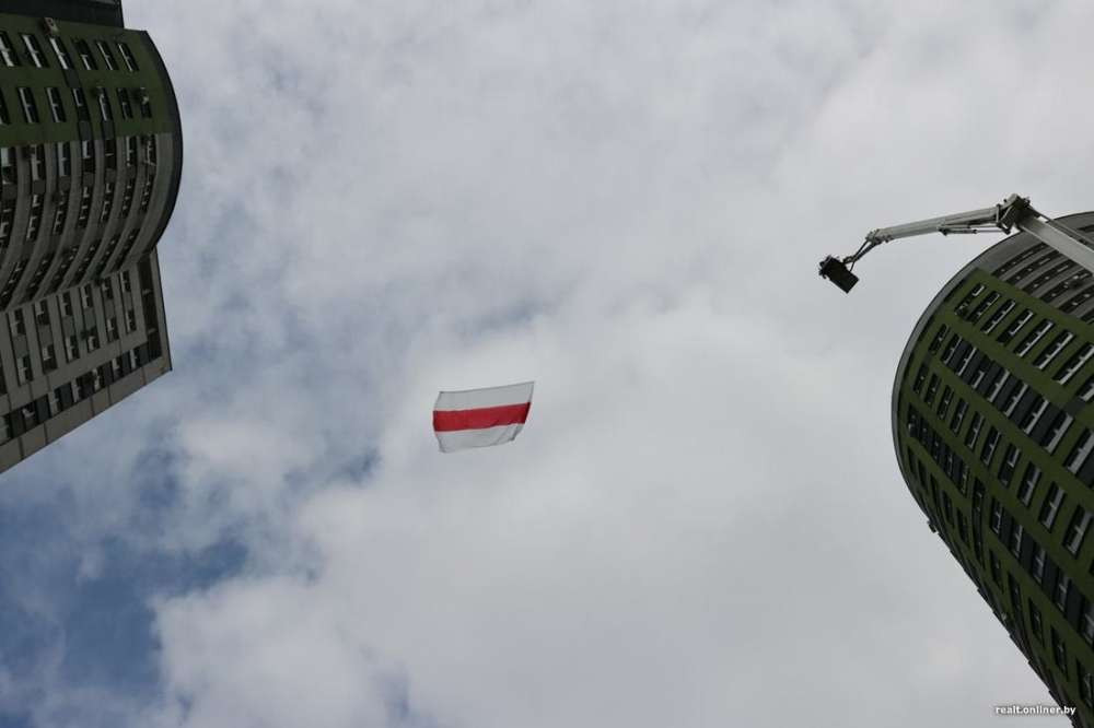 Как пишет портал onliner.by, бело-красно-белые флаги впервые появились в жилом комплексе "Каскад" больше месяца назад. Чтобы снять их, был задействован альпинист из МЧС. Также ведомство под различными формулировками неоднократно выписывало штрафы. Но людей это не остановило. Жители комплекса регулярно вывешивают на растяжках флаги на высоте 20-го этажа, и к ним регулярно приезжает автокран МЧС, чтобы снять эти флаги.