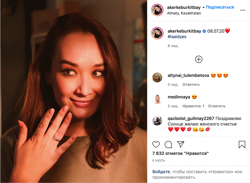 Ранее певица Акерке Буркитбай выложила в Instagram фотографию с кольцом на безымянном пальце. Тогда подписчики в комментариях предположили, что предложение сделал сын Розы Рымбаевой Али Окапов. Однако позже фото Буркитбай все же удалила.