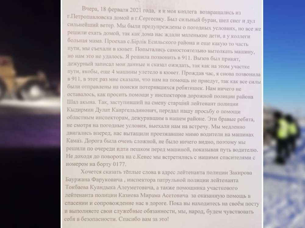 18 февраля жительницы района Шал акына в СКО ехали на машине из Петропавловска. Одну из них дома ждали дети, другую − больная мать. Из-за практически нулевой видимости за селом Бирлик машина съехала в кювет. Женщины позвонили на номер 911, однако в тот день почти все силы спасателей и полицейских были брошены на поиски двух заблудившихся в буране бирликских детей. Навстречу путницам выдвинулся экипаж батальона патрульной полиции, обслуживающий трассу. Из кювета автомобиль вытянули дальнобойщики.
