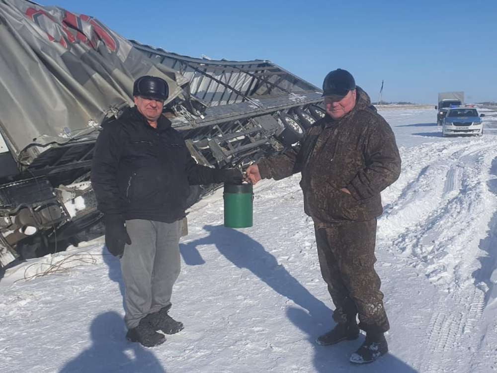 Чтобы помочь водителю Volvo, они обратились к директору агрофирмы, который Серику Женапинову. Тот не только предоставил погрузчик и тягач, но и передал водителю термос с горячим обедом.