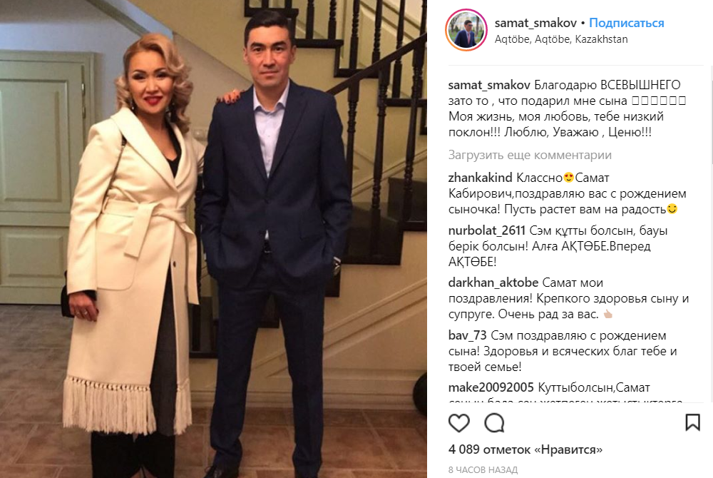 Казахстанский футболист, генеральный директор футбольного клуба "Актобе" Самат Смаков объявил о рождении четвертого ребенка. Радостным известием он поделился на своей странице Instagram.