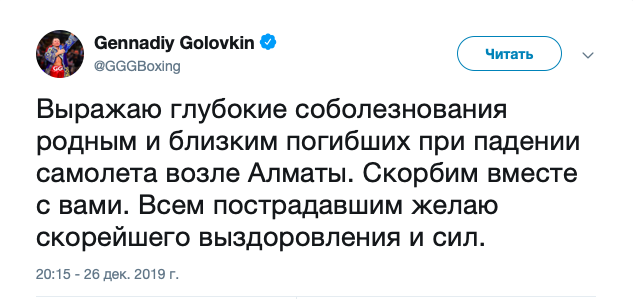 "Выражаю глубокие соболезнования родным и близким погибших при падении самолета возле Алматы. Скорбим вместе с вами. Всем пострадавшим желаю скорейшего выздоровления и сил", - опубликовал в своем Twitter боксер.