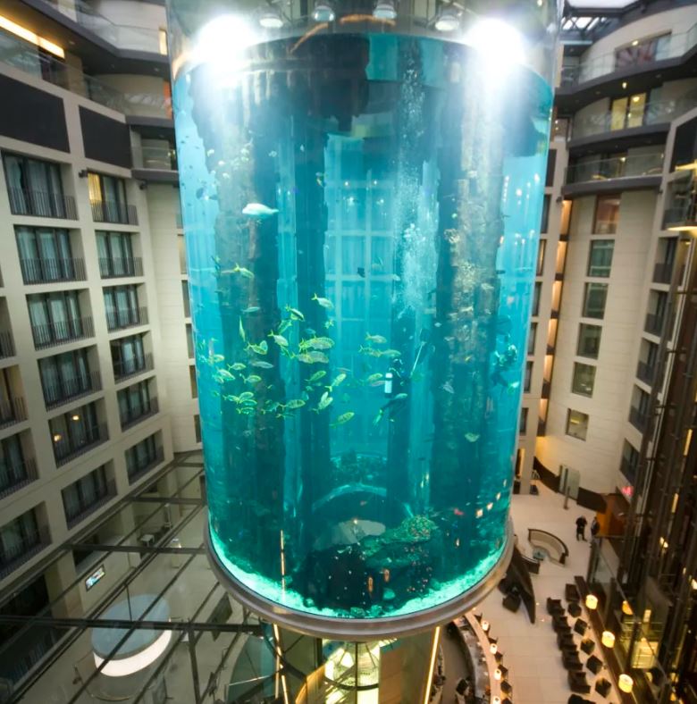 Известно, что в аквариум был залит миллион литров воды. Его высота составляет 16 метров, а диаметр 11,5 метра. Раньше за 19 евро посетители могли даже подняться на лифте, чтобы посмотреть на аквариум и всех его обитателей.