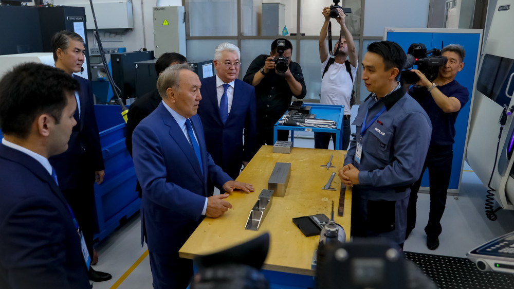 В ходе осмотра Президенту Казахстана были представлены возможности сборочно-испытательного комплекса космических аппаратов.
