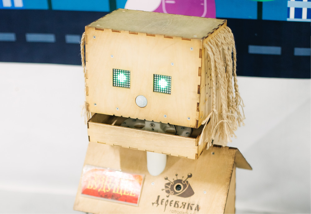 «Деревяка» - добрый и очень обаятельный робот с настоящей русской душой, он похож на домовёнка, крутит шаманку, подмигивает гостям выставки, задает вопросы и гадает всем желающим, предсказывая судьбу.