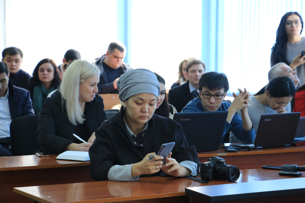 Прокурор зачитывает обвинительный акт. Объем дела составляет 2 224 тома, в списке обвинения заявлено 205 свидетелей. На скамье подсудимых первый заместитель председателя правления – председатель кредитного комитета - Ж. Жаримбетов, директор по кредитованию - К. Садыков и бывший председатель правления - С.Мәмеш.