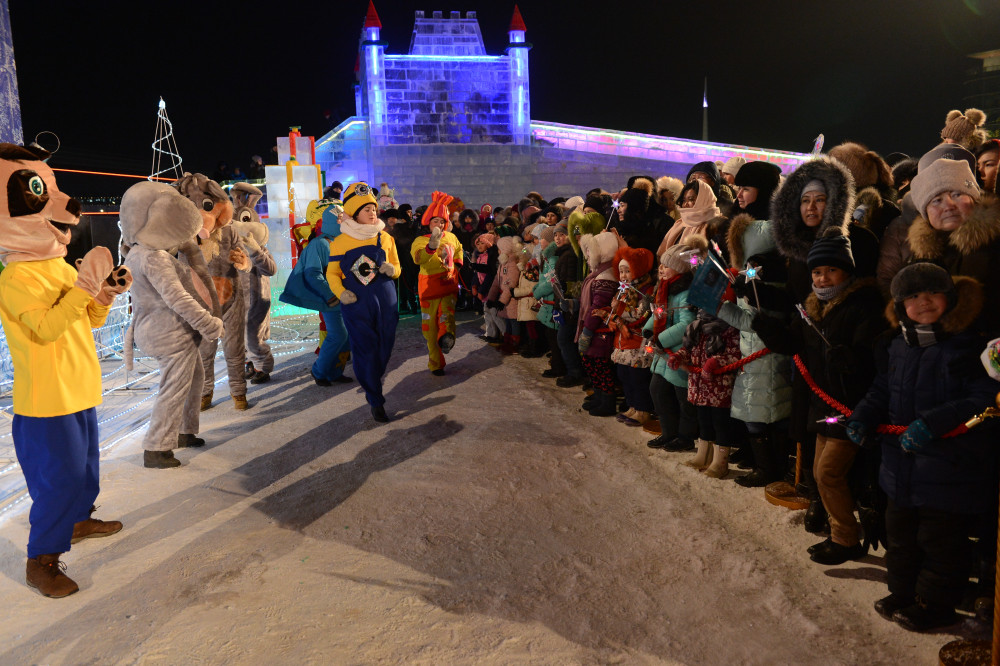 Особый интерес у детей вызовет и копия знаменитого дворца Дисней Лэнда высотой шесть метров. Яркими красками разбавят композицию фигурки миньонов, героев популярных комиксов, молнии Макуин, трехметровые ледяные статуи Деда Мороза и Снегурочки. Все они выполнены из цветного льда.