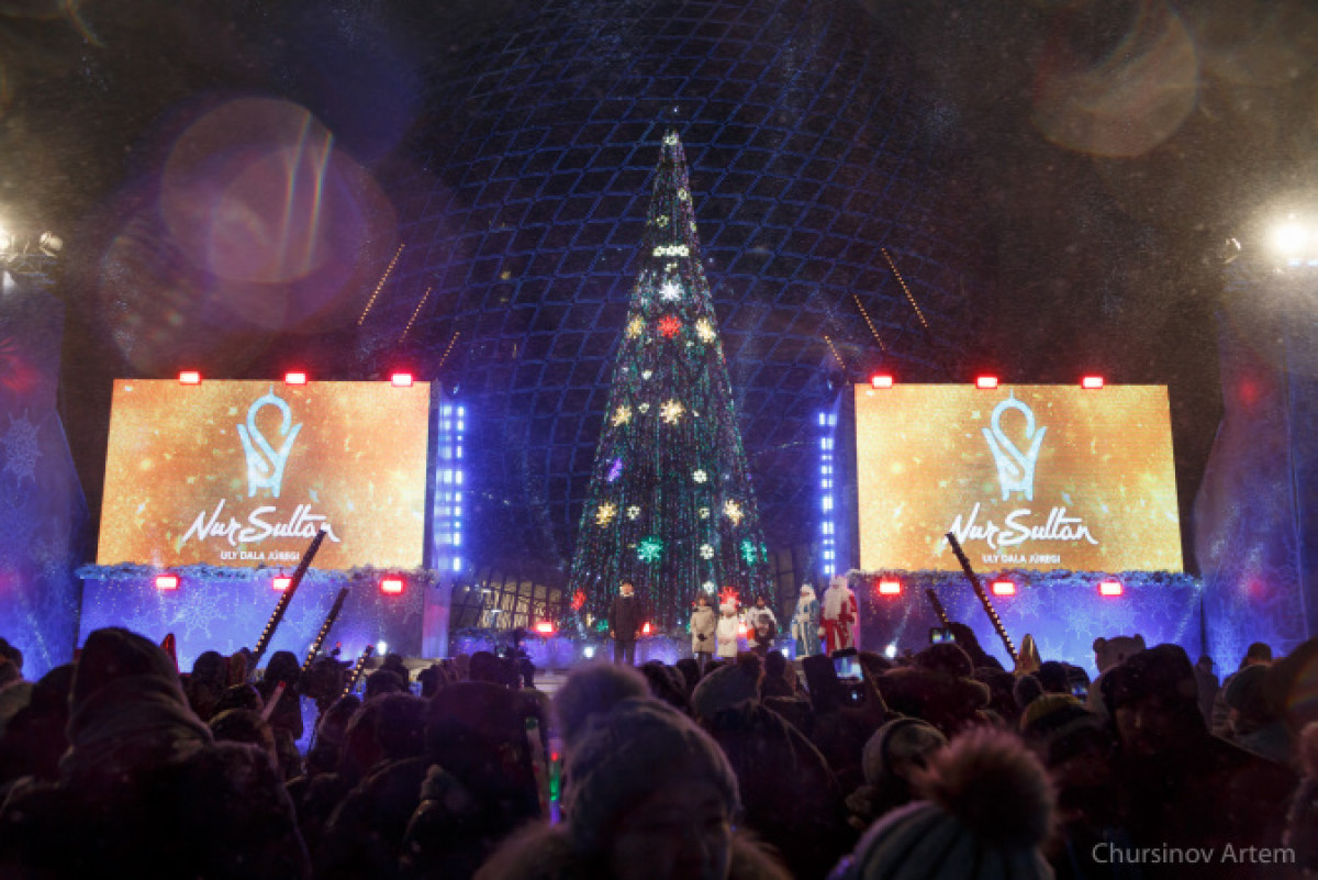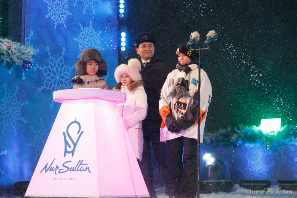 Правом зажечь главную елку страны удостоились аким Нур-Султана Алтай Кульгинов, обладательница гран-при международного конкурса "Елордама арнадым" Сания Жолжаксынова, призер международной математической олимпиады Нурахмет Мухтияр и лучший воспитанник детской-юношеской спортивной школы по хоккею с шайбой Артемий Пермяков.