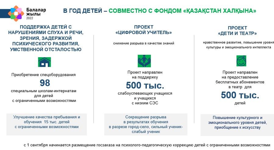 Во всех регионах страны проходит акция "Балалардың игілігі үшін". Особое внимание уделяется решению социальных вопросов. К примеру, в рамках акции "Дені сау бала" во всех регионах республики проходят благотворительные акции по оказанию помощи детям с особыми образовательными потребностями. Создаются условия для инклюзивного образования, увеличивается количество коррекционных, психолого-медико-педагогических кабинетов.