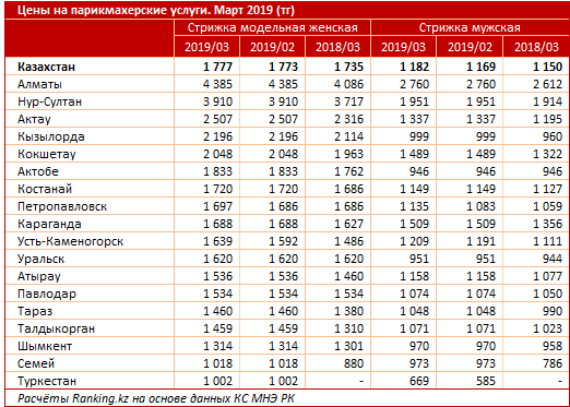 По итогам марта текущего года в Казахстане стрижки обходились женщинам в среднем в 1777 тенге (на 2,4% дороже, чем год назад, и на 0,2% — чем месяцем ранее); мужчинам — в 1182 тенге (на 2,8% больше, чем годом ранее, и на 1,1% — чем в феврале).