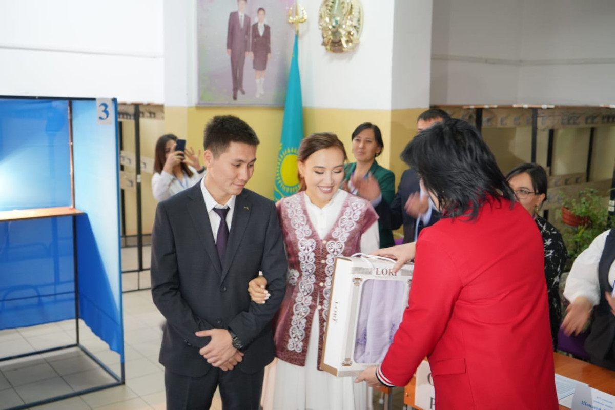 Молодожёны голосовали и на других участках, например, в Шымкенте. На избирательном участке №77 проголосовали Даурен Тойбол и Акмарал Калдыбаева. Они отдали свои голоса в день создания семьи.