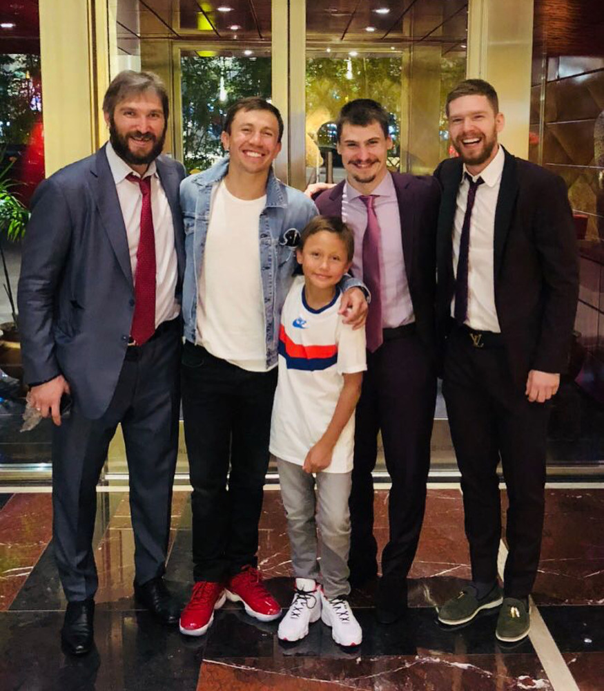 Боксёр опубликовал в своём Instagram совместное фото с новоиспечёнными обладателями Кубка Стэнли. На снимке присутствуют хоккеисты Александр Овечкин, Евгений Кузнецов, Дмитрий Орлов, а также сын GGG – Вадим, который, кстати, занимается хоккеем в США.