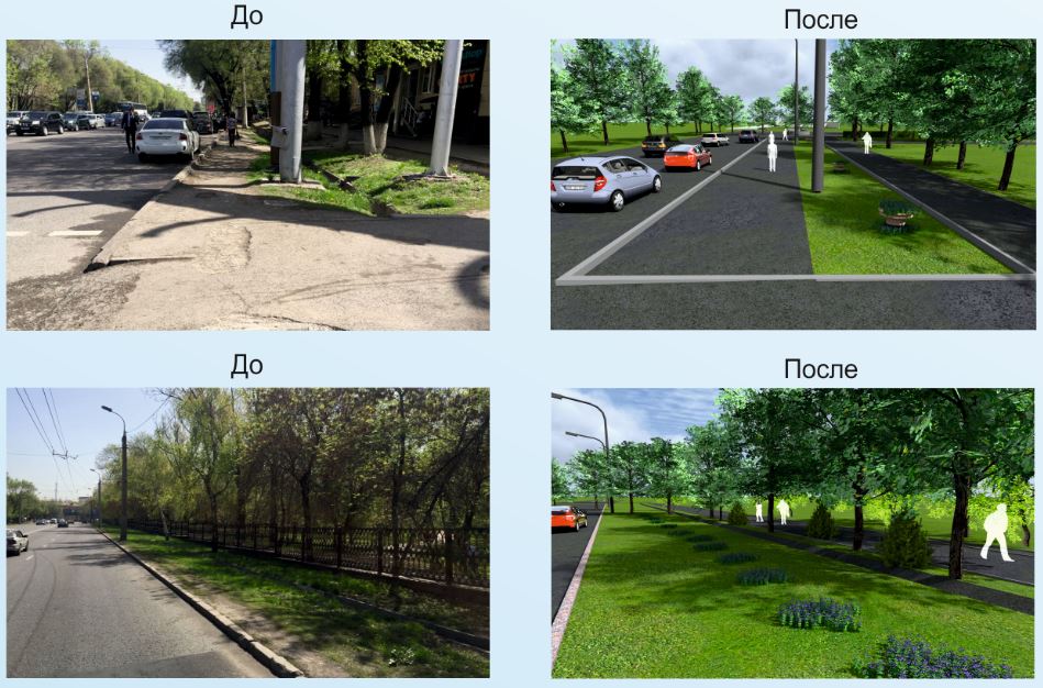 Проекты предполагают укладку брусчатки, арыков, урн, лавочек, демонтаж ограждений. Будут установлены спортивный инвентарь, детские площадки, посажены деревья, живая изгородь, клумбы и др.