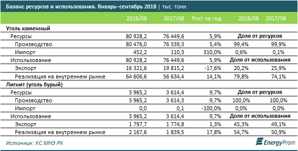 Непосредственно коксующегося угля, используемого для доменной плавки, добыто 8,9 млн тонн (+0,2% за год); энергетического, необходимого для отопления — 70,6 млн тонн, на 5,4% больше, чем в аналогичном периоде 2017 года.