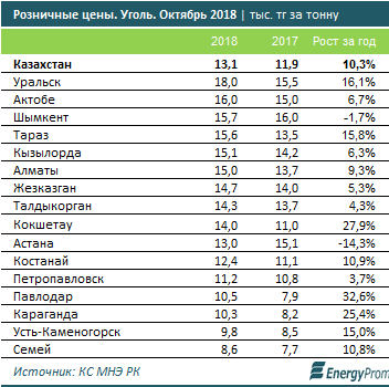 На внутреннем рынке по итогам октября 2018, тонна угля обходилась казахстанцам в среднем по РК в 13,1 тыс. тенге — сразу на 10,3% больше, чем в октябре 2017 года.