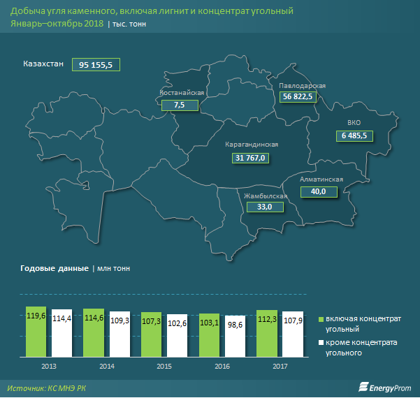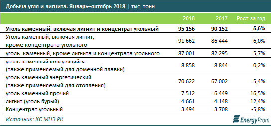По итогам января–октября 2018 года добыча каменного угля и угольного концентрата достигла 95,2 млн тонн, что на 5,6% больше, чем в аналогичном периоде годом ранее, сообщается в исследовании Еnergyprom.kz.