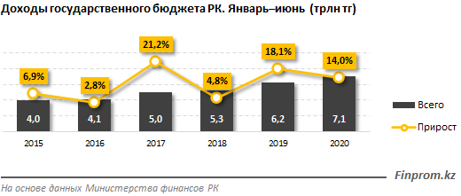 Как сообщает издание, за первое полугодие 2020 года доходы государственного бюджета РК увеличились на 14 процентов к аналогичному периоду 2019 и достигли 7,1 триллиона тенге. Тогда как в январе–июне 2019 года сумма доходов составляла 6,2 триллиона тенге, при годовом увеличении на 18,1 процента.