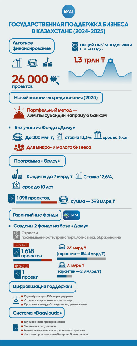 В 2025 году Казахстан усиливает меры поддержки предпринимателей, делая упор на доступное кредитование, гарантирование и цифровую прозрачность. По итогам 2024 года льготное финансирование получили 26 тысяч проектов на сумму около 1,3 трлн тенге, а в 2025-м внедряется новый портфельный механизм субсидирования и запускаются гарантийные фонды на базе "Даму", передает BAQ.kz.