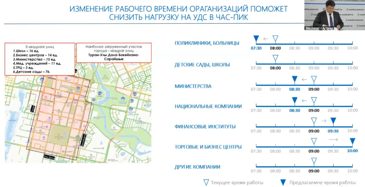 По словам чиновника, в настоящее время акимат работает с 8:30, и рассматривается возможность сдвига рабочего времени центральных исполнительных органов. Этот шаг поможет равномерно распределить потоки транспорта и пассажиров, что улучшит движение по столице.