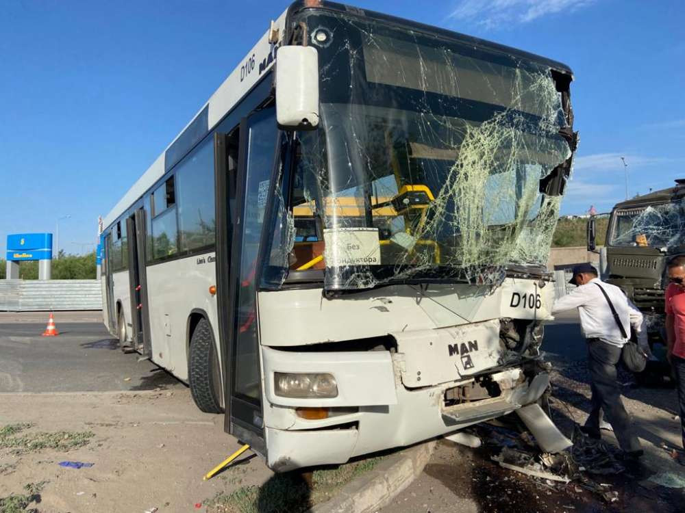 "29 мая в 17:49 водитель 1994 года рождения, управляя автомашиной марки "КамАЗ", следуя по ул. Акжол со стороны ул. Досмухамедулы в сторону ул. Жанажол (напротив АЗС "Гелиос"), не справившись с рулевым управлением, выехал на полосу встречного движения и допустил столкновение с маршрутным автобусом марки МАN", - говорится в сообщении ДП города.
