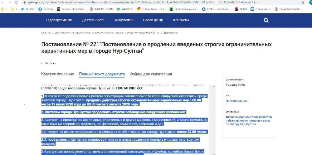 На официальном сайте департамента контроля качества и безопасности товаров и услуг Нур-Султана удалили постановление главного санитарного врача столицы о запрете на пешее передвижение по городу после 23:00, передает BaigeNews.kz.