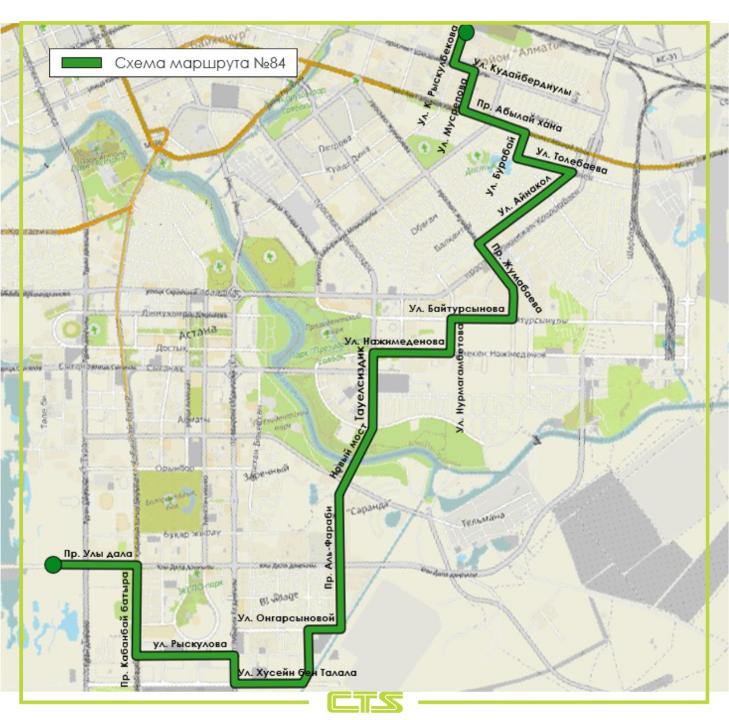 Новый маршрут №84 сообщением "Жилой комплекс "Дәстүр" – "улица К.Рыскулбекова" будут обслуживать 10 автобусов. Курсировать они будут через новый мост по проспекту Тәуелсіздік. Таким образом, улучшится транспортное сообщение между правобережьем и левоборежьем столицы, отметили в акимате.