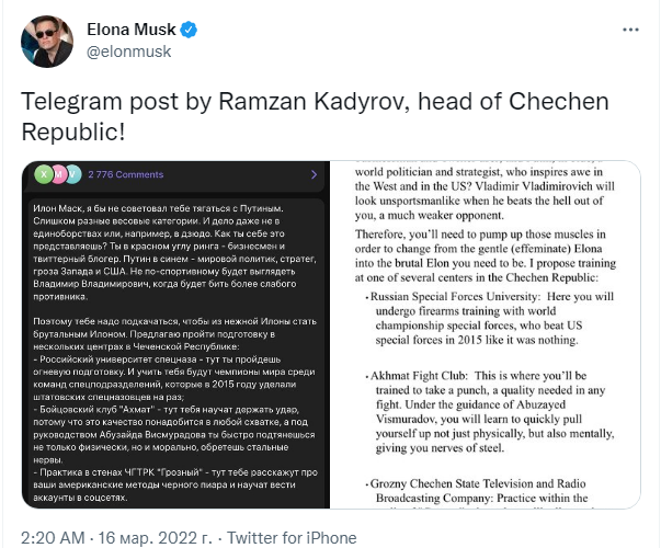 "Илон Маск, я бы не советовал тебе тягаться с Путиным. Слишком разные весовые категории. И дело даже не в единоборствах или, например, в дзюдо. Как ты себе это представляешь? Ты в красном углу ринга - бизнесмен и твиттерный блогер. Путин в синем - мировой политик, стратег, гроза Запада и США. Не по-спортивному будет выглядеть Владимир Владимирович, когда будет бить более слабого противника. Поэтому тебе надо подкачаться, чтобы из нежной Илоны стать брутальным Илоном", - написал в своем Telegram-канале Кадыров.