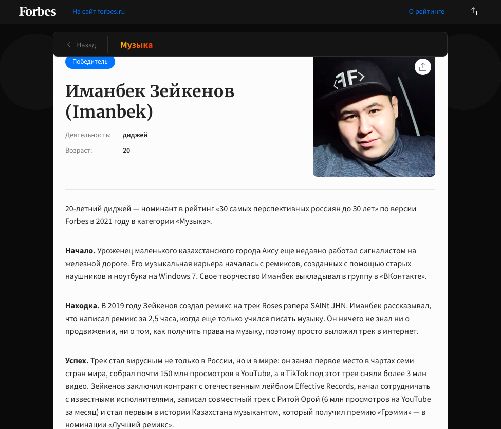 На сайте Forbes.ru опубликованы номинанты и победители по 10 категориям. В каждой категории по 10 участников. В направлении "Музыка" Иманбек разделил победу с российской группой Cream Soda и битмейкером Slava Marlow.