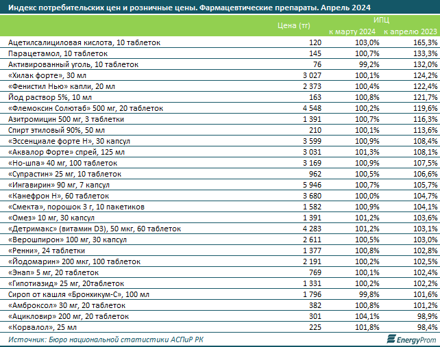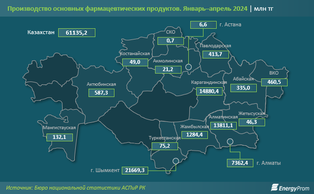 За январь–апрель текущего года в стране произвели фармацевтической продукции на 61,1 млрд тг — на 6,7% больше в стоимостном выражении, чем годом ранее, передаёт BaigeNews со ссылкой на Energyprom.