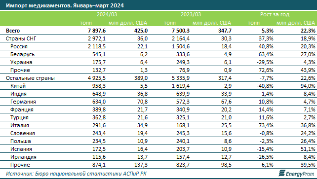 Из стран, не входящих в состав СНГ, Казахстан завёз 4,9 тыс. тонн медикаментов на сумму 389 млн долл. США. Основным поставщиком для РК стал Китай: 958,3 млн тонн лекарств — на 40,8% меньше, чем в январе–марте прошлого года. В пятёрку ключевых стран также вошли Индия, Германия, Франция и Турция.