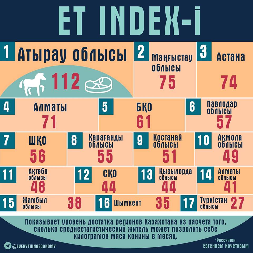 Индекс конины появился в Казахстане. Разработал проект экономист Евгений Кочетов. По его словам, ET INDEX-i показывает сколько среднестатистический житель региона может позволить себе килограммов мяса конины исходя из месячного дохода.