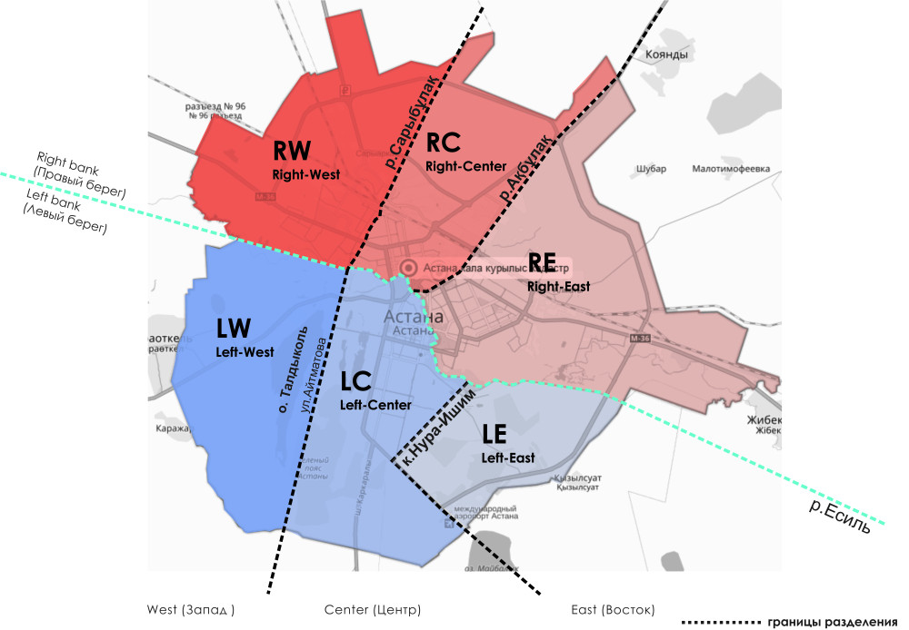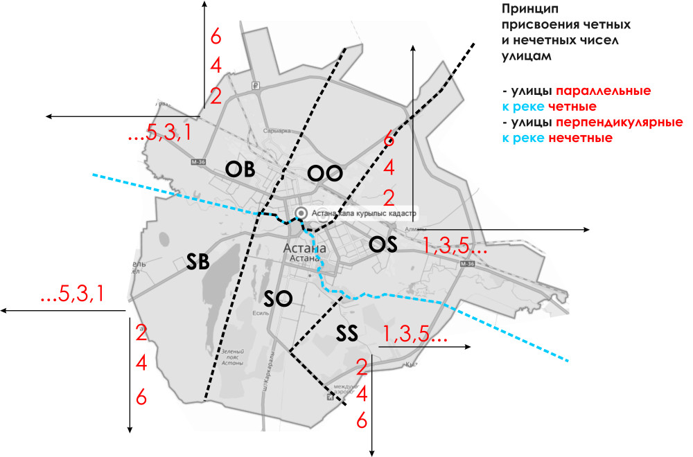 Принцип присвоения индексов улицам заключается в разделении города на шесть ориентировочных районов – это правый берег – запад, центр, восток и, соответственно, левый берег – запад, центр, восток. Границы разделения соответствуют естественным границам, таким как реки Есиль, Сарыбулак, Акбулак, озеро Талдыколь и канал Нура-Ишим.